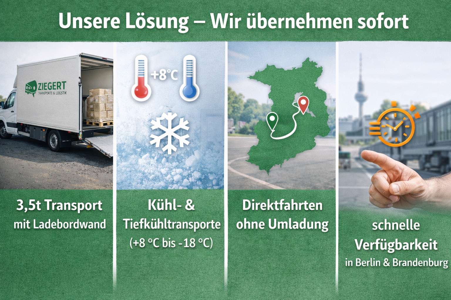 Direktfahrten ohne Umladung · 3,5t Transport mit Ladebordwand · Kühl- & Tiefkühltransporte (+8 °C bis -18 °C) sofort verfügbar